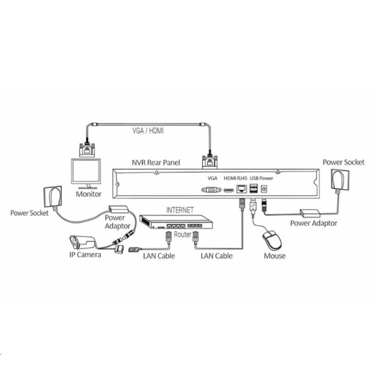 | Obsah balenia | NVR jednotka s 8 kanálmi, SATA pripojením pre až 8TB disk 4x IP Bullet IP66 kamera s nočným prísvitom 1x napájací adaptér DC 12V 2A pre NVR 4x napájací adaptér DC 12V 1A pre kamery 4x sada na upevnenie kamery 4x bajonetová tesniaca krytka pre RJ45 konektor 1xUSB myš 1x SATA kábel pre pripojenie HDD 1x Používateľský manuál |