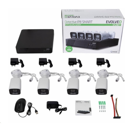 | Ostatné | Smartlife (Tuya) aplikácia v CZ pre iOS a Android iCMS Program pre OS Windows Podpora Onvif protokolu Rozpoznávanie pohybu z obrazu Možnosť rozšírenia o Antivandal kameru, alebo wifi kameru z ponuky EVOLVEO Podpora USB myši (myš v balení) 8 kanálový Full HD rekordér NVR s IP pripojením kamier v lokálnej sieti 4× vonkajšia celokovová kamera s napájacím adaptérom Mikrofón pre záznam zvuku 1/2,9" 2Mp CMOS snímač |