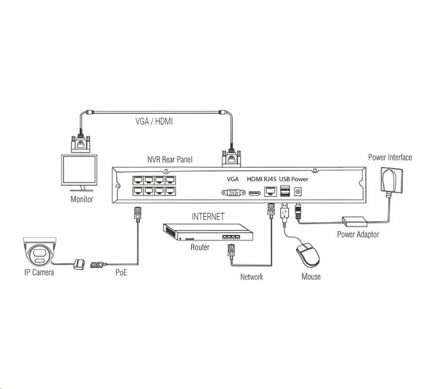 | Obsah balenia | NVR jednotka s 8x LAN/POE vstupom, SATA pripojením pre až 8TB disk 4x POE Bullet IP66 kamera s nočným prísvitom 1x napájací adaptér DC 48V 2A 4x sada na upevnenie kamery 4x bajonetová tesniaca krytka pre RJ45 konektor 1x USB myš 1x SATA kábel pre pripojenie HDD 1x Užívateľský manuál |