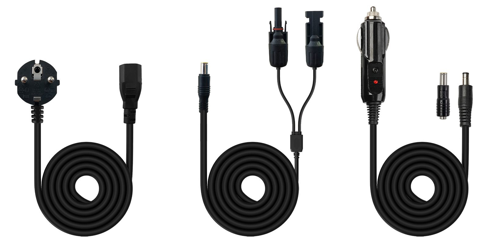 - Nabíjacie káble v balení: 1× do zásuvky 230 V, 1× do auta a 1× pre solárny panel