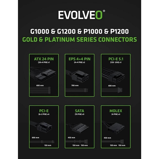 EVOLVEO P1000 zdroj 1000W, 80+ PLATINUM, ATX 3.1, aPFC, 140 mm ventilátor, 3 roky záruka, černý