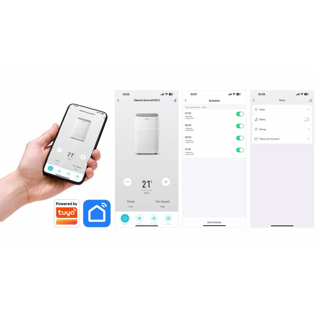 Klímu je možné prepojiť s mobilným telefónom vďaka bezplatnej aplikácii Tuya SmartLife, ktorú si môžete stiahnuť pre iPhone aj všetky zariadenia so systémom Android. Vybrať si môžete zo dvoch spôsobov pripojenia – WiFi alebo Bluetooth. Mobilná aplikácia ponúka tieto možnosti ovládania a prehľadov: