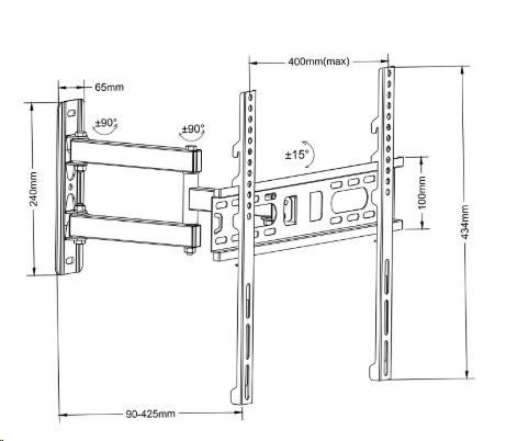 Technické údaje: nosnosť 30kg podporuje VESA štandardy 100x100 až 400x400 na všetky typy televízorov s uhlopriečkou 26-55" otáčanie na obe strany +/- 90° sklopenie obrazovky nahor alebo nadol +/- 15° nastavenie vzdialenosti od steny v rozmedzí 90-425mm zabezpečenie obrazovky proti vysadeniu kvalitná oceľová konštrukcia ukotvenie do steny na 3 hmoždinky inštalačný materiál súčasťou balenia farebné prevedenie čierne výborná kvalita záruka 3 roky Kĺbový držiak na TV FM761 podporuje VESA štandardy: VESA 100x100 VESA 200x100 a 100x200 VESA 200x200 VESA 300x200 a 200x300 VESA 300x300 VESA 400x200 a 200x400 VESA 400x300 a 300x400 VESA 400x400 Držiak nepodporuje VESA štandard 75x75, ktorý býva u najmenších televízorov a monitorov. Nástenný držiak FM761 je vhodný na zavŕšenie všetkých typov televízorov a monitorov, ktoré podporujú niektorý z vyššie uvedených VESA štandardov a ich hmotnosť nie je vyššia ako 30kg. Zavrieť môžete ako klasické rovné, tak aj zakrivené televízory a monitory. Na uhlopriečke televízora alebo monitora nezáleží, ak nie je prekročená nosnosť držiaka a váš TV podporuje niektorý z uvedených VESA štandardov, môžete zavrieť aj podstatne väčšie obrazovky.