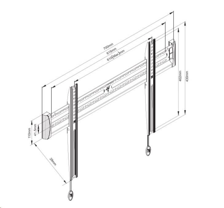 Fixný držiak TV NB C3F Fixný držiak na TV 43-80", VESA 75x75 až 600x400, vzdialenosť TV od steny 29mm, systém click-connect pre automatické upevnenie TV na držiak, nosnosť 56kg Fixný držiak prémiovej kvality na LCD LED TV 43-80". Držiak podporuje VESA štandardy 100x100 až 600x400, vzdialenosť TV od steny je 29mm. Vďaka systému click-connect sa televízor po zavese na držiak automaticky upevní proti nechcenému vysadeniu, uvoľnenie je pomocou táhel. Na držiak je možné zavesiť všetky typy a značky televízorov s hmotnosťou až 56kg. Fixný držiak LCD LED plazma TV NB C3-F Technické údaje: nosnosť 56kg na televízory s uhlopriečkou 43" až 80" podporuje VESA štandard 100x100 až 600x400mm vzdialenosť od steny 29mm automatické zabezpečenie televízie proti vysadeniu - systém click-connect výborná kvalita, veľmi pevný a úplne spoľahlivý držiak na TV jednoduchá a rýchla inštalácia balenie obsahuje sadu skrutiek, vrutov a hmoždiniek záruka 5 rokov Nástenný fixný držiak na TV 43-80" v prémiovej kvalite - VESA 100x100 až 600x400, vzdialenosť od steny 29mm, systém click-connect, nosnosť 56kg NB C3F Fixný držiak na televízie NB C3F podporuje VESA štandardy: VESA 100x100 VESA 200x100 a 100x200 VESA 200x200 VESA 300x100 a 100x300 VESA 300x200 a 200x300 VESA 300x300 VESA 400x200 a 200x400 VESA 400x300 a 300x400 VESA 400x400 VESA 600x200 VESA 600x400