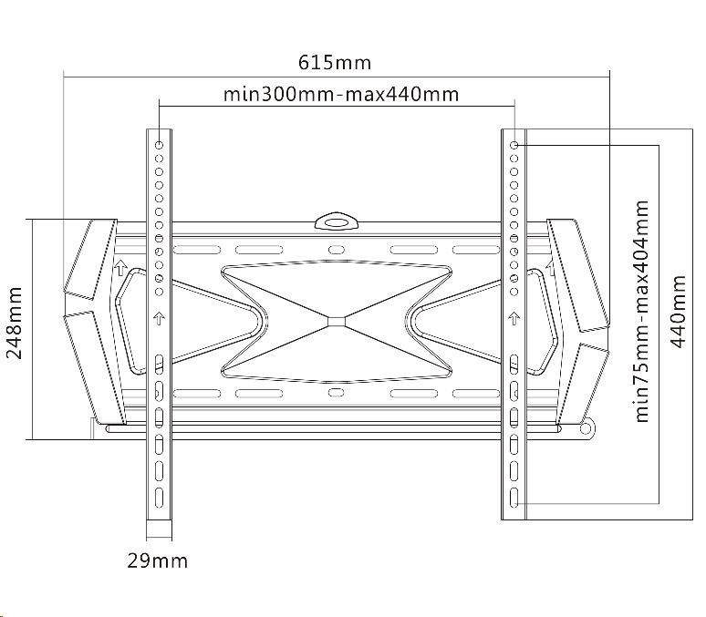 Technické údaje: nosnosť 40kg podpora VESA 300x200 až 400x400 na televízory a monitory s uhlopriečkou 42-55" systém pre uzamknutie TV na držiaku (zámok nie je súčasťou balenia) vzdialenosť od steny 22mm veľmi pevná konštrukcia dizajnové krytky inštalačný materiál, vodováha farebné prevedenie čierne záruka 3 roky Držiak podporuje VESA: VESA300x200 VESA 300x300 VESA 400x200 VESA 400x300 VESA 400x400 v prípade demontáže stredového dizajnového krytu umožníte nastavenie VESA 100x100, VESA 200x100 a VESA 200x200