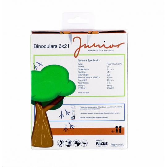 < p >Focus Junior 6x21 je perfektný binokulárny ďalekohľad, ktorý nesmie chýbať vo výbave žiadneho malého pozorovateľa.< /p > < p >Výber zo dvoch farebných prevedení ocení nielen chlapci, ale aj odvážne dievčatá. Tento malý kapesný ďalekohľad je určený pre deti s rozsahom očí medzi 50 - 63 mm. Špeciálna konštrukcia s jedným centrálnym kĺbom zabezpečí ideálnu stabilitu.< /p > < p >Veľké zaostrovacie koliesko uľahčuje úpravu ostrosti a povrchová úprava optiky poskytuje jasný obraz.< /p > < p >Kaučukové telo je odolné voči nárazom a zároveň zabezpečuje bezpečné a príjemné uchopenie. Vďaka tomu sa vyhnete nechceným pádom z dôvodu nepríjemného držania, čo ocení každý rodič.< /p > < p >Vďaka 6-násobnému zväčšeniu umožníte svojím deťom rýchlejšie a jednoduchšie zazrieť vtáky alebo iné zvieratá, ktoré deti jednoducho milujú.< /p > < p >Balenie tiež obsahuje puzdro na opasok, nákrčník a čistiacu handričku na optiku.< /p > < p >Švédska značka Focus Sport Optics vyrába optiku od roku 1985. Jej produkty sú v severských krajinách, kde je príroda nekompromisná, obľúbené vďaka skvelému pomeru ceny a výkonu.< /p >