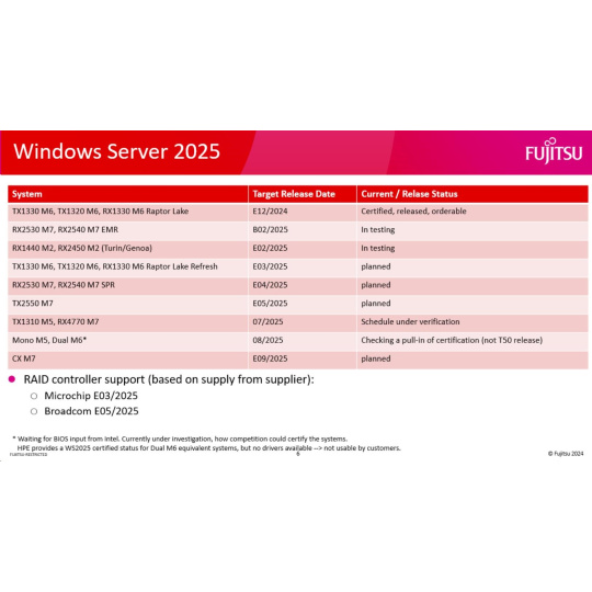 Windows Server 2025 Essentials 10 Core ROK. Available only to Fujitsu Broadline Distributors with the ROK Agreement. License card with a COA label; COA label to be affixed on a server system before server shipment. Ships with a server system to the end user.