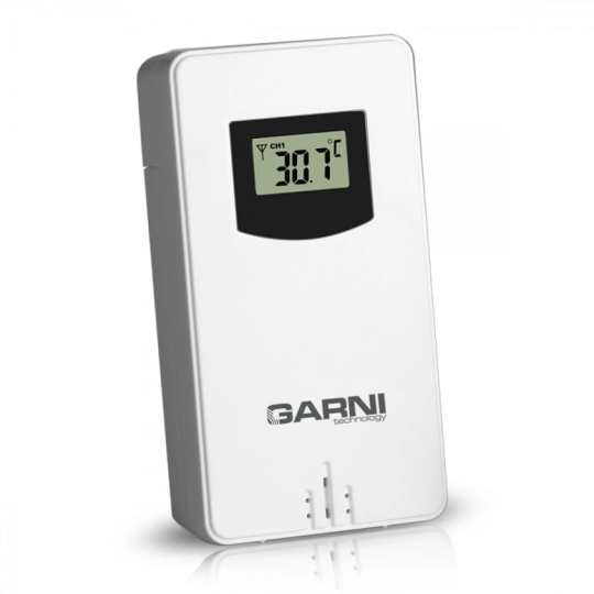 Bezdrôtové čidlo na meranie teploty, určené pre meteorologickú stanicu GARNI 365 Arcus vlhkosti odolné, krytie IPX4 (odolné voči striekajúcej vode) displej o rozmeroch 19 x 11 mm veľkosť číslic na displeji: teplota 6,5 mm meranie teploty 3 kanály maximálny RF výkon 10 dBm (10 mW) možnosť postavenia a zavešenia farba biela