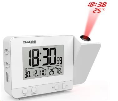Digitálny budík s projekciou času a vnútornej teploty s LCD displejom, časom riadeným rádiovým signálom DCF-77 a meraním vnútornej teploty a relatívnej vlhkosti LCD displej o rozmere 63 x 42 mm s možnosťou stálého osvetlenia pri napájaní sieťovým adaptérom, alebo krátkodobým osvetlením na 8 s pri napájaní batériami 3 stupne jasu osvetlenia displeja, možnosť vypnutia osvetlenia displeja (pri napájaní sieťovým adaptérom) veľkosť číslic na displeji – čas 25 mm, dátum, skratka názvu dňa, vnútorná teplota a rel. vlhkosť 8,5 mm čas a dátum riadené signálom DCF-77 s možnosťou manuálneho nastavenia ikona príjmu signálu DCF-77 skratka názvu dňa 12-hodinový alebo 24-hodinový formát zobrazenia času možnosť nastavenia časového pásma od -12 do +12 hodín budík s 2 budícími časmi s funkciou opakovaného bdenia (Snooze) po 5 minútach budící signál - 10 sekúnd 1 pípnutie za sekundu, 10 sekúnd 2 pípnutia za sekundu, 10 sekúnd 4 pípnutia za sekundu a potom stály pípací zvuk projekcia času a vnútornej teploty s možnosťou otočenia obrazu o 180°, možnosť sklopenia tubusu projektora o 90° dopredu a dozadu farba projekcie červená stále projekcie pri napájaní sieťovým adaptérom s možnosťou vypnutia zobrazenie hodnôt vnútornej teploty a relatívnej vlhkosti zobrazenie teploty vo °C, alebo °F USB port na nabíjanie mobilných zariadení (len pri napájaní hlavnej jednotky sieťovým adaptérom), maximálny nabíjací prúd 1 000 mA napájanie sieťovým adaptérom, alebo batériami možnosť postavenia farba čierna Obsah balenia: 1 x digitálny budík GARNI 140 1 x sieťový adaptér český, slovenský, nemecký, anglický, taliansky, poľský a maďarský návod