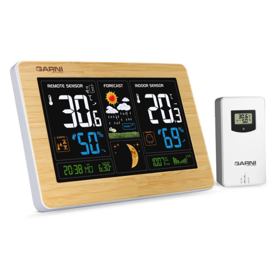 ? inverzný farebný VA displej o rozmeroch 167 x 93 mm s možnosťou stályho osvetlenia pri napájaní sieťovým adaptérom, alebo krátkodobým osvetlením na 15 s pri napájaní batériami ? ? veľkosť číslic na displeji – čas, dátum, barometrický tlak 8 mm, skratka názvu dňa 6 mm, vnútorná a vonkajšia teplota 30 mm, vnútorná a vonkajšia relatívna vlhkosť 20 mm ? čas a dátum riadené signálom DCF-77 s možnosťou manuálneho nastavenia ? ikona príjmu signálu DCF-77 ? skratka názvu dňa ? 12-hodinový alebo 24-hodinový formát zobrazenia času ? možnosť nastavenia časového pásma od -12 do +12 hodín ? ? budíkový signál - 10 sekúnd 1 pípnutie za sekundu, 10 sekúnd 2 pípnutia za sekundu, 10 sekúnd 4 pípnutia za sekundu a potom stále 8 pípnutí za sekundu ? 6 animovaných ikon predpovede počasia (slnečno, polojasno, oblačno, zrážky, silný dážď a sneženie) na základe sledovania barometrického tlaku zabudovaným barometrickým čidlom ? ? ? meranie absolútneho barometrického tlaku (mb / hPa alebo inHg) ? šipky tendencie vývoja absolútneho barometrického tlaku, vnútorná a vonkajšia teplota a rel. vlhkosť ? ? zobrazenie teploty vo C alebo F ? možnosť použitia až 3 bezdrôtových čidiel GARNI 30H (jedno čidlo GARNI 030H je súčasťou dodávky) ? funkcia automatického prepínania kanálov ? 5 ikon vnútorného tepelného pohody ? bezdrôtový prenos hodnôt vonkajšej teploty a relatívnej vlhkosti na frekvencii 433 MHz ? ikona príjmu signálu bezdrôtového čidla ? zobrazenie fázy Mesiaca ? USB port pre nabíjanie mobilných zariadení (len pri napájaní hlavnej jednotky sieťovým adaptérom), maximálny nabíjací prúd 1 000 mA ? ikony slabých batérií ? napájanie sieťovým adaptérom alebo batériami ? možnosť postavenia alebo zavesenia ? farba biela, predný rámeček z bambusového dreva Bezdrôtové čidlo GARNI 030H ? vlhkosti odolné ? displej o rozmeroch 19 x 11 mm ? veľkosť číslic na displeji: teplota a relatívna vlhkosť 4 mm ? meranie teploty a relatívnej vlhkosti ? 3 kanály ? maximálny RF výkon 10 dBm (10 mW) ? možnosť postavenia a zavesenia ? farba biela Obsah balenia: 1 x hlavná jednotka GARNI 547 Line 1 x bezdrôtové čidlo GARNI 030H 1 x sieťový adaptér český, slovenský, nemecký, anglický, holandský, poľský a maďarský návod