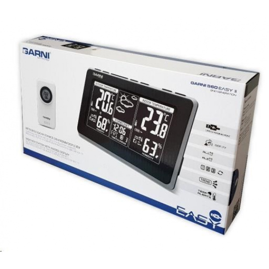 Meteorologická stanica s inverzným LCD displejom s časovo riadeným rádiovým signálom DCF-77, budíkom, meraním vnútornej teploty a relatívnej vlhkosti, bezdrôtovým čidlom na meranie vonkajšej teploty a relatívnej vlhkosti a USB portom na napájanie externých zariadení. Mobilný telefón a USB kábel nie sú súčasťou balenia - inverzný LCD displej o rozmeroch 169 x 94 mm s možnosťou stályho osvetlenia pri napájaní sieťovým adaptérom, alebo krátkodobým osvetlením na 8 s pri napájaní batériami - dva stupne jasu osvetlenia displeja, možnosť vypnutia osvetlenia displeja (pri napájaní sieťovým adaptérom) - pri napájaní len batériami možno rozsvietiť displej zvukom, napr. klepnutím, tlesknutím a pod. - veľkosť číslic na displeji – čas 12,5 mm, dátum a skratka názvu dňa 8 mm, vnútorná a vonkajšia teplota 38 mm, vnútorná a vonkajšia relatívna vlhkosť 23 mm - čas riadený signálom DCF-77 s možnosťou manuálneho nastavenia - ikona príjmu signálu DCF-77 - 12-hodinový alebo 24-hodinový formát zobrazenia času - možnosť nastavenia časového pásma od -12 do +12 hodín - budík s 2 budícími časmi s funkciou opakovaného budenia (Snooze) nastaviteľného od 3 do 20 minút - budící signál - 10 sekúnd 1 pípnutie za sekundu, 10 sekúnd 2 pípnutia za sekundu a následne stály 4 pípnutia za sekundu - 13 ikon predpovede počasia v 6 úrovniach (jasno, polojasno, oblačno, dážď, búrky a sneženie) na základe sledovania barometrického tlaku vestaveným barometrickým čidlo - zobrazenie hodnôt vnútorné a vonkajšej teploty a relatívnej vlhkosti - šípky tendencie vývoja vnútornej a vonkajšej teploty - možnosť nastavenia alarmu horná a spodná hranica vnútorné a vonkajšej teploty (akustickým signálom a ikonou na displeji) - zobrazenie teploty vo °C alebo °F - možnosť použitia až 3 bezdrôtových čidiel GARNI 040H (jedno je súčasťou balenia) - funkcia automatického prepínania kanálov - bezdrôtový prenos hodnôt vonkajšej teploty a relatívnej vlhkosti na frekvencii 433 MHz - ikona príjmu signálu bezdrôtového čidla - USB port na nabíjanie mobilných zariadení (len pri napájaní hlavnej jednotky sieťovým adaptérom), maximálny nabíjací prúd 1 000 mA - napájanie sieťovým adaptérom alebo batériami - možnosť postavenia alebo zavešenia - farba čierna s striebornou Bezdrôtové čidlo GARNI 040H - odolné voči vlhkosti, krytie IP44 (odolné proti strekajúcej vode) - kruhový displej o priemere 19 mm - veľkosť číslic na displeji: teplota a relatívna vlhkosť 5 mm - meranie teploty a relatívnej vlhkosti - 3 kanály - maximálny RF výkon 10 dBm (10 mW) - možnosť postavenia a zavešenia - farba biela Obsah balenia: 1 x hlavná jednotka GARNI 560 EASY II 1 x bezdrôtové čidlo GARNI 040H 1 x sieťový adaptér český, slovenský, nemecký, anglický, poľský a maďarský návod