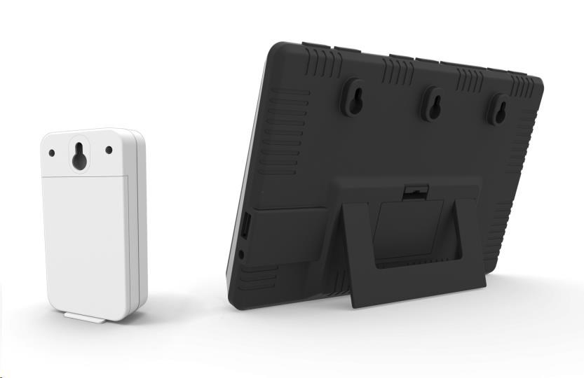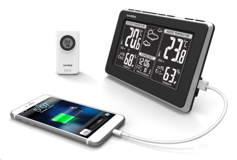 Meteorologická stanica s inverzným LCD displejom s časovo riadeným rádiovým signálom DCF-77, budíkom, meraním vnútornej teploty a relatívnej vlhkosti, bezdrôtovým čidlom na meranie vonkajšej teploty a relatívnej vlhkosti a USB portom na napájanie externých zariadení. Mobilný telefón a USB kábel nie sú súčasťou balenia - inverzný LCD displej o rozmeroch 169 x 94 mm s možnosťou stályho osvetlenia pri napájaní sieťovým adaptérom, alebo krátkodobým osvetlením na 8 s pri napájaní batériami - dva stupne jasu osvetlenia displeja, možnosť vypnutia osvetlenia displeja (pri napájaní sieťovým adaptérom) - pri napájaní len batériami možno rozsvietiť displej zvukom, napr. klepnutím, tlesknutím a pod. - veľkosť číslic na displeji – čas 12,5 mm, dátum a skratka názvu dňa 8 mm, vnútorná a vonkajšia teplota 38 mm, vnútorná a vonkajšia relatívna vlhkosť 23 mm - čas riadený signálom DCF-77 s možnosťou manuálneho nastavenia - ikona príjmu signálu DCF-77 - 12-hodinový alebo 24-hodinový formát zobrazenia času - možnosť nastavenia časového pásma od -12 do +12 hodín - budík s 2 budícími časmi s funkciou opakovaného budenia (Snooze) nastaviteľného od 3 do 20 minút - budící signál - 10 sekúnd 1 pípnutie za sekundu, 10 sekúnd 2 pípnutia za sekundu a následne stály 4 pípnutia za sekundu - 13 ikon predpovede počasia v 6 úrovniach (jasno, polojasno, oblačno, dážď, búrky a sneženie) na základe sledovania barometrického tlaku vestaveným barometrickým čidlo - zobrazenie hodnôt vnútorné a vonkajšej teploty a relatívnej vlhkosti - šípky tendencie vývoja vnútornej a vonkajšej teploty - možnosť nastavenia alarmu horná a spodná hranica vnútorné a vonkajšej teploty (akustickým signálom a ikonou na displeji) - zobrazenie teploty vo °C alebo °F - možnosť použitia až 3 bezdrôtových čidiel GARNI 040H (jedno je súčasťou balenia) - funkcia automatického prepínania kanálov - bezdrôtový prenos hodnôt vonkajšej teploty a relatívnej vlhkosti na frekvencii 433 MHz - ikona príjmu signálu bezdrôtového čidla - USB port na nabíjanie mobilných zariadení (len pri napájaní hlavnej jednotky sieťovým adaptérom), maximálny nabíjací prúd 1 000 mA - napájanie sieťovým adaptérom alebo batériami - možnosť postavenia alebo zavešenia - farba čierna s striebornou Bezdrôtové čidlo GARNI 040H - odolné voči vlhkosti, krytie IP44 (odolné proti strekajúcej vode) - kruhový displej o priemere 19 mm - veľkosť číslic na displeji: teplota a relatívna vlhkosť 5 mm - meranie teploty a relatívnej vlhkosti - 3 kanály - maximálny RF výkon 10 dBm (10 mW) - možnosť postavenia a zavešenia - farba biela Obsah balenia: 1 x hlavná jednotka GARNI 560 EASY II 1 x bezdrôtové čidlo GARNI 040H 1 x sieťový adaptér český, slovenský, nemecký, anglický, poľský a maďarský návod