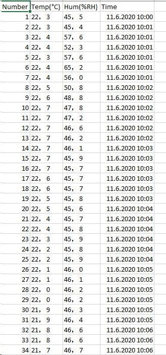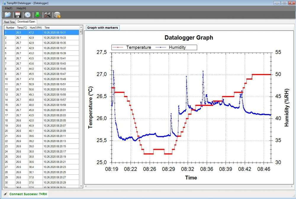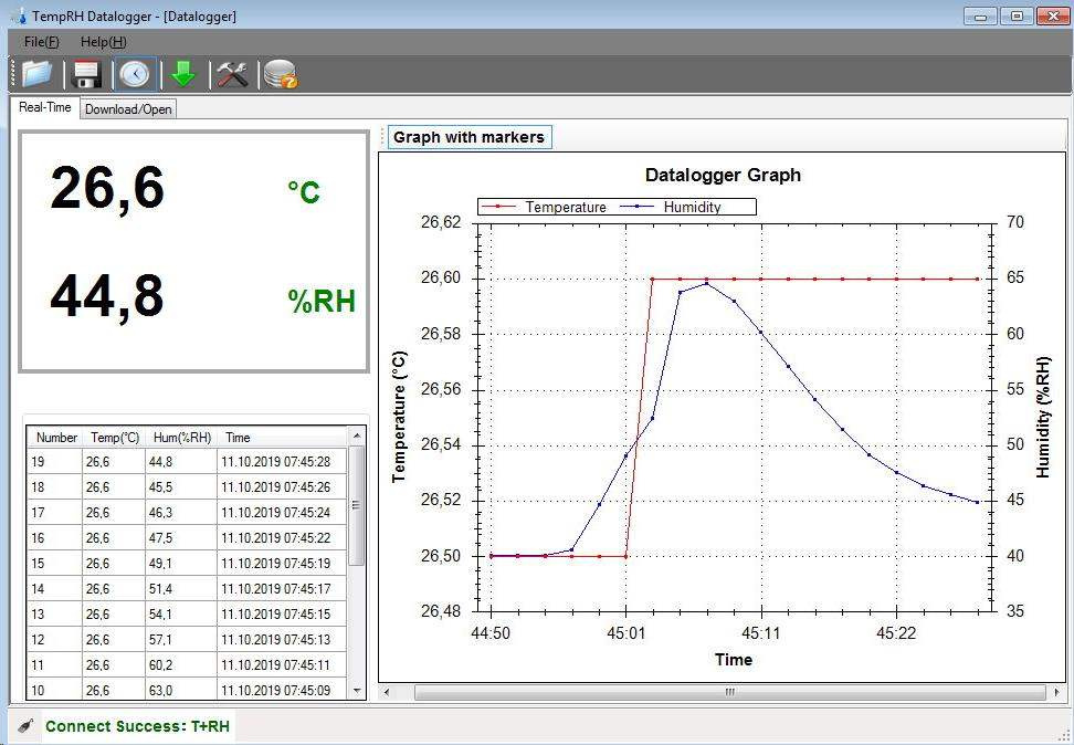 pamäť pre 20 010 hodnôt teploty a vlhkosti LCD displej o rozmeroch 22 x 20 mm pre zobrazenie aktuálnych, minimálnych a maximálnych nameraných hodnôt možnosť nastavenia načítania dát od 2 sekúnd do 24 hodín (2 až 30 s, ďalej 1, 5, 15, 30 min, ďalej 1, 5,12, 24 hodín) pripojenie k počítaču cez USB port nastaviteľný alarm horná a dolná hranica pre teplotu a relatívnu vlhkosť program TempRH Datalogger pre zobrazenie nameraných hodnôt pre OS Windows až do verzie Windows 10 (32 bit a 64 bit) zobrazenie nameraných dát v reálnom čase v priloženom programe vrátane grafu možnosť odloženého začatia merania dáta vo forme správy v pdf formáte a tabuľky vo formáte *.csv a vo formáte *.imtr (Meter Files - možné otvoriť priloženým programom) súčasťou balenia je datalogger, pútko, batéria, CD s programom a návod