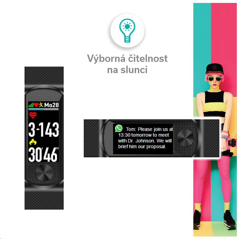 - zobrazenie na náramku - dátum, priebeh plnenia stanovených cieľov, stav batérie, ikona aktuálneho režimu, ikona zapnutého budíka, ikona pripojenia k mobilnému zariadeniu aktuálny čas, počet krokov, kalórie, tepová frekvencia a ďalej vo športovom režime podľa volby v aplikácii, až 8 zvolených údajov