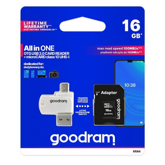 Karta GOODRAM microSDHC 16GB M1A4 All-in-one (R:100/W:10 MB/s), UHS-I Class 10, U1 + adaptér + čítačka kariet OTG