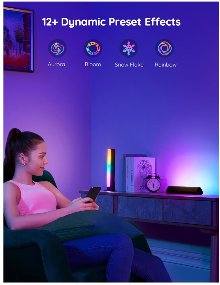 Vylepšite svoje herné, filmové a hudobné zážitky pomocou živého inteligentného osvetlenia Govee Flow Plus. 16 miliónov farieb s 12 režimami, vrátane 4 režimov na synchronizáciu s hudbou, posúva zážitok zo sledovania televízie alebo hrania hier na novú úroveň. Ovládajú sa hlasom cez Siri, Amazon Alexa alebo Google Assistant, cez aplikáciu alebo cez Control box. Preto nebudete musieť ani vstávať z gauča. Vďaka univerzálnym držiakom ich môžete kreatívne využívať a prispôsobovať svojim potrebám na televízore alebo na otvorenom priestranstve. Farebné podsvietenie opticky zväčšuje obraz, šetrí oči a má životnosť až 50 000 hodín.