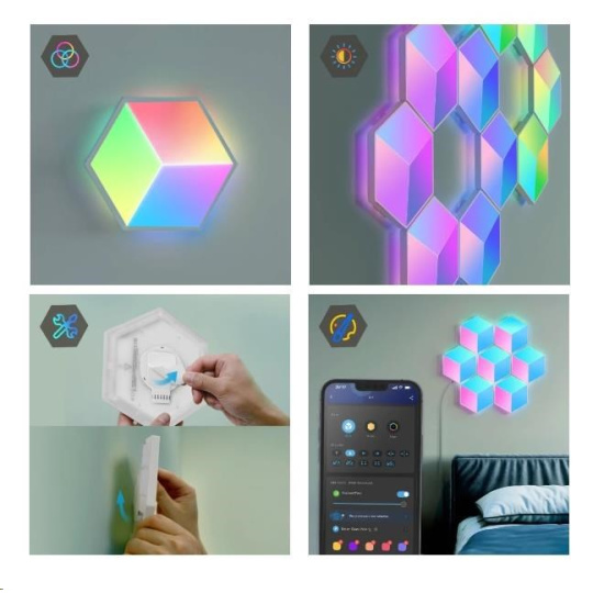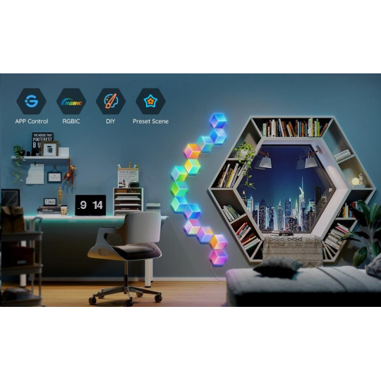 Govee Hexa Pro ponúka 38 rôznych režimov pre dokonalé naladenie svetelnej atmosféry. Govee technológia RGBIC dokáže zobraziť až 57 farieb naraz z celkového rozsahu 16 miliónov farieb pri intenzite 1-100%. Môže sa tiež pochváliť životnosťou až 50.000 hodín.