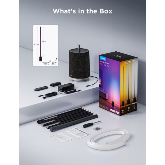 Govee Floor Lamp Pro vychádza z modelu Lyra. Je to minimalistická, moderná stojacia lampa s BT reproduktorom, ktorá prináša dokonalú podívanú a dokonalý zvukový zážitok. Lampa ponúka veľmi slušný výkon 2100 lúmenov. Vďaka 324 LED diódam s technológiou 4 v 1 RGBICWW, ktoré možno rozdeliť až do 54 nezávisle programovateľných segmentov, dokáže lampa poskytnúť veľkolepé predstavenie, ako sú dokonalé farebné gradienty, komplexné farebné vizuály a skvelý jas a kontrast. Dosahuje svetlo ohromujúcej intenzity. K dispozícii je viac ako 16 miliónov farieb alebo biela laditeľná od 2200 do 6500 K. Podlahová lampa Pro je vybavená aj BT reproduktorom, takže k nej môžete pripojiť telefón alebo televízor a používať ju na prehrávanie hudby alebo filmov. Okrem toho sa lampa dodáva s 29 predvoľbami bieleho šumu, ktoré vám pomôžu sústrediť sa, relaxovať alebo zaspať. Vďaka funkcii DreamView môžete lampu synchronizovať s ďalšími svietidlami Govee a jedným dotykom vytvoriť atmosféru na akúkoľvek príležitosť. Lampa meria 172 cm, ale zaberá minimum miesta, takže ju môžete umiestniť doslova kdekoľvek. Najviac sa však bude cítiť v rohu alebo pri stene, kde maximálne osvetlí priestor za sebou a vyčarí na stenách úžasne plynulé farebné gradienty. Životnosť lampy Govee je štandardných 25 000 hodín. Možno ju ovládať pomocou aplikácie Govee Home, Google Home, Google Assistant, Apple a Amazon. Pre maximálne pohodlie nájdete v balení aj klasický diaľkový ovládač, ktorý je vždy pripravený, pripnutý priamo na lampe. Samozrejmosťou sú prednastavené scény, ktorých je 81, niekoľko režimov synchronizácie s hudbou, a ak si ani to nevyberiete, čaká na vás režim DIY, ktorý vám poskytne 100% kontrolu, kde jediným obmedzením je vaša fantázia.