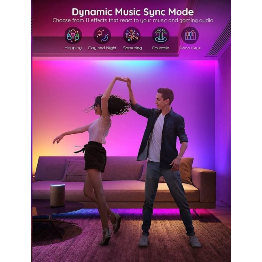 Úsporné interiérové chytré LED pásiky Govee WiFi RGBIC PRO SMART 5m s životnosťou až 50.000 hodín spravia z vášho domu designový skvost. Môžete ich použiť takmer všade - obývačka, spálňa, kuchyňa, pracovňa atď. Zobrazuje až 16 miliónov farieb, ktorých intenzitu môžete nastaviť od 1-100 % a vďaka technológii RGBIC si môžete rozdeliť pásik na samostatné segmenty, pre ktoré si potom môžete voliť rozdielne farby. Vyberte si zo 64 režimov osvetlenia a pri počúvaní obľúbenej hudby sa budú svetlá synchronizovať vďaka vstavanému mikrofónu a vytvoria nezabudnuteľný zážitok. Alebo si jednoducho nastavte vlastné farebné kombinácie v režime DIY. Príkazy môžete zadávať aj hlasovo cez Siri, Amazon Alexa alebo Google Assistant, cez aplikáciu Govee Home na smartfóne alebo tablete alebo cez Control box. Svetlo má dĺžku 5 metrov a jeho inštalácia je veľmi jednoduchá. Pomocou časovača môžete svetlá zapínať a vypínať automaticky podľa západu a východu slnka, alebo zaspávania a ranného vstávania.