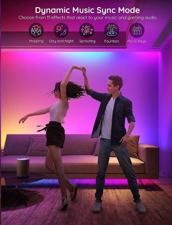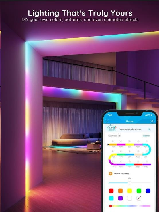 Úsporné interiérové chytré LED pásiky Govee WiFi RGBIC PRO SMART 5m s životnosťou až 50.000 hodín spravia z vášho domu designový skvost. Môžete ich použiť takmer všade - obývačka, spálňa, kuchyňa, pracovňa atď. Zobrazuje až 16 miliónov farieb, ktorých intenzitu môžete nastaviť od 1-100 % a vďaka technológii RGBIC si môžete rozdeliť pásik na samostatné segmenty, pre ktoré si potom môžete voliť rozdielne farby. Vyberte si zo 64 režimov osvetlenia a pri počúvaní obľúbenej hudby sa budú svetlá synchronizovať vďaka vstavanému mikrofónu a vytvoria nezabudnuteľný zážitok. Alebo si jednoducho nastavte vlastné farebné kombinácie v režime DIY. Príkazy môžete zadávať aj hlasovo cez Siri, Amazon Alexa alebo Google Assistant, cez aplikáciu Govee Home na smartfóne alebo tablete alebo cez Control box. Svetlo má dĺžku 5 metrov a jeho inštalácia je veľmi jednoduchá. Pomocou časovača môžete svetlá zapínať a vypínať automaticky podľa západu a východu slnka, alebo zaspávania a ranného vstávania.