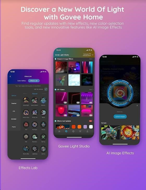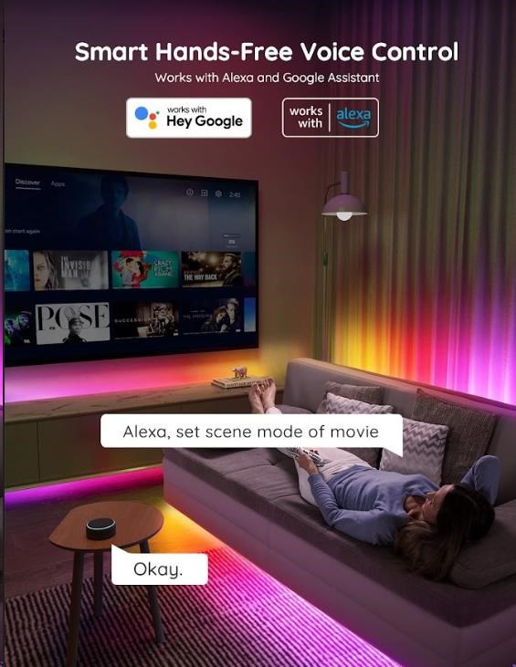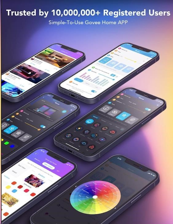 Spravujte nastavenia farieb a intenzity svetla jednoducho pomocou aplikácie Govee Home. Aplikácia je zadarmo na stiahnutie v Google Play a AppStore. Navyše získate prístup k funkcii časovača, DIY farbám, režimu videa, synchronizácii hudby a scénickým režimom. Môžete si tiež pomocou časovača nastaviť automatické vypínanie a zapínanie, napríklad podľa doby zaspávania a vstávania. Ovládanie hlasom je možné cez Siri, Amazon Alexa a Google Assistant.