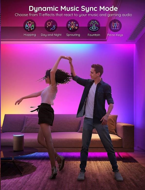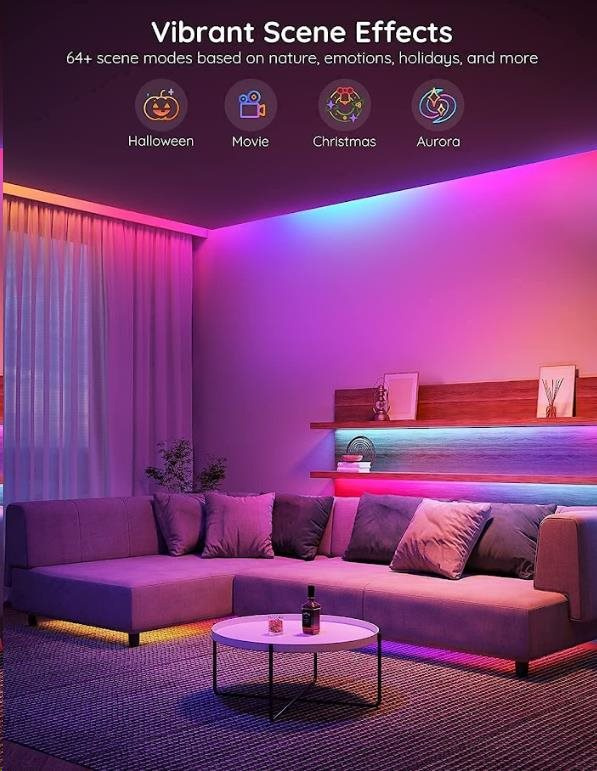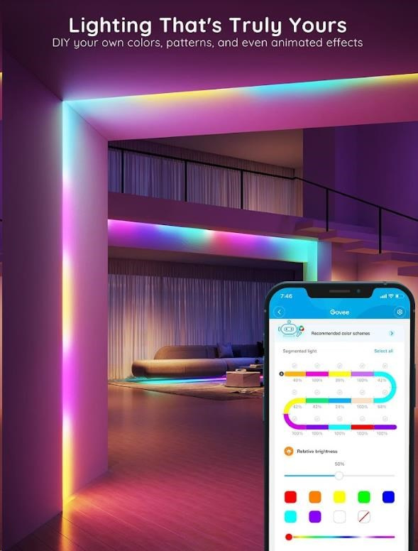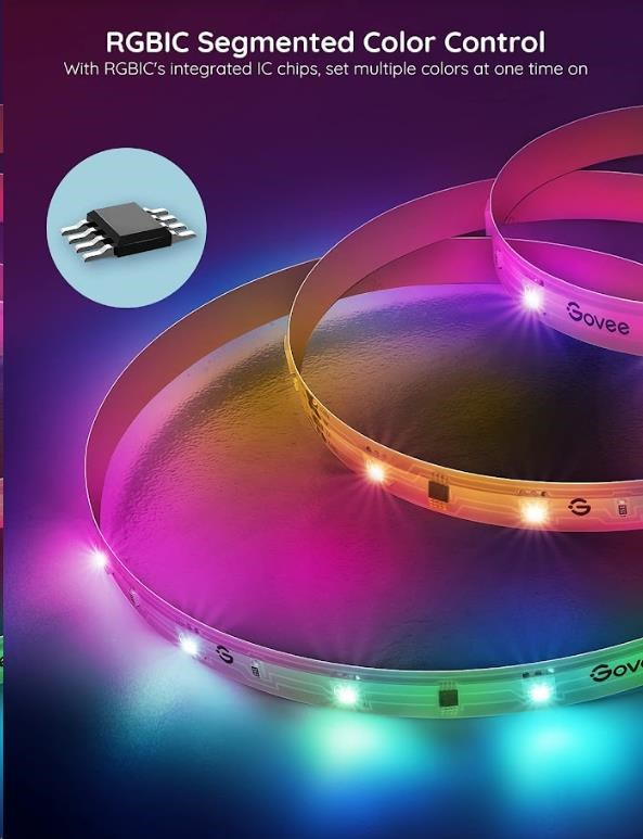 Úsporné interiérové chytré LED pásky Govee WiFi RGBIC PRO SMART 10m s životnosťou až 50.000 hodín urobia z vášho domu dizajnový skvost. Môžete ich použiť prakticky všade - obývacia izba, spálňa, kuchyňa, pracovňa atď. Zobrazujú až 16 miliónov farieb, ktorých intenzitu je možné nastaviť od 1-100 % a vďaka technológii RGBIC si môžete rozdeliť pásik na samostatné segmenty, pre ktoré si následne môžete voliť odlišné farby. Vyberte si zo 64 režimov osvetlenia a pri počúvaní obľúbenej hudby sa budú svetlá synchronizovať vďaka vestavenej mikrofónu a vytvoria nezabudnuteľný zážitok. Alebo si jednoducho nastavte svoje vlastné farebné kombinácie v režime DIY. Príkazy môžete zadávať aj hlasom cez Siri, Amazon Alexa alebo Google Assistant, cez aplikáciu Govee Home na chytrom telefóne alebo tablete alebo cez Control box. Svetlo má dĺžku 10 metrov a jeho inštalácia je veľmi jednoduchá. Pomocou časovača môžete svetlá zapínať a vypínať automaticky podľa západu a východu slnka, alebo usínania a vstávania.