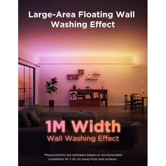 Vďaka svojej zavesenej inštalácii vytvára Govee Strip Light jedinečný „plávajúci“ efekt, ktorý rovnomerne osvetľuje steny záplavou farieb. Pokročilá technológia RGBICWW LED spolu so systémom LuminBlend™ zaisťuje plynulé prechody a ohromujúci vizuálny zážitok. Výsledkom je veľkoplošné osvetlenie, ktoré okamžite premení každú miestnosť na moderný a dynamický priestor.