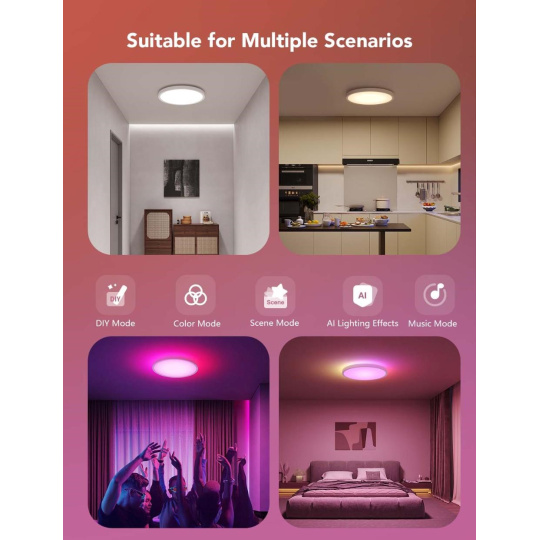 Objavte viac ako 70 inteligentných scén pre dokonalé osvetlenie vášho priestoru! Duálne stropné svietidlo Govee ponúka v aplikácii výkonný režim DIY, ktorý vám umožní vytvoriť si osvetlenie podľa vlastných predstáv. Ľahko si vytvoríte atmosféru, ktorá sa hodí na akúkoľvek príležitosť a v akomkoľvek štýle. Navyše vďaka funkcii Dreamview synchronizujte viacero svetiel Govee na rovnakú farbu, aby ste dosiahli skvelý efekt. Oživte svoj domov so zariadením Govee!
