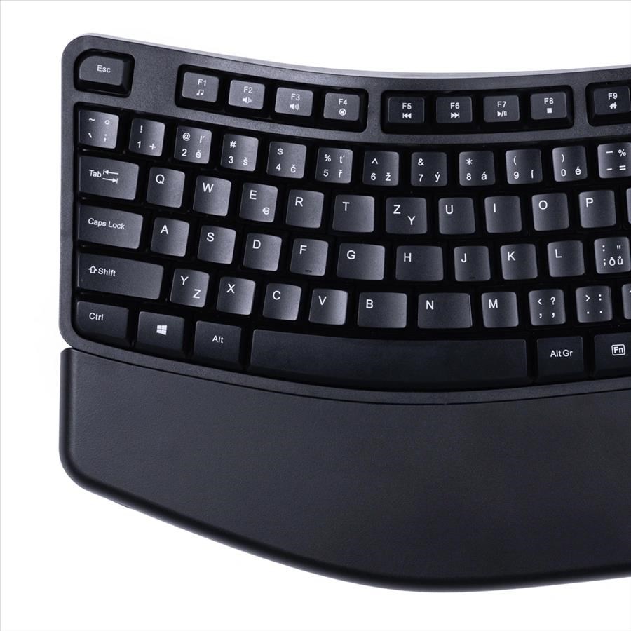 - ergonomicky tvarovaná klávesnica pre väčší komfort a správne držanie tela pri práci, predchádza bolestiam a preťaženiu ramien a šije