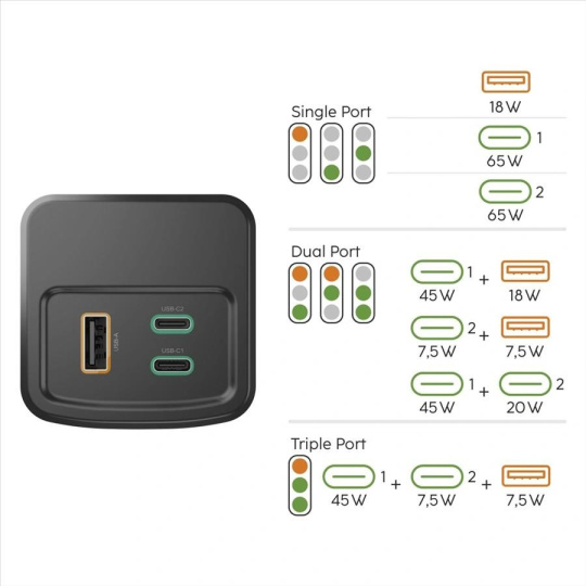 - výstup 1: USB-C zásuvka: 5 V/3 A; 9 V/3 A; 12 V/3 A; 15 V/3 A; 20 V/3,25 A (max. 65 W)