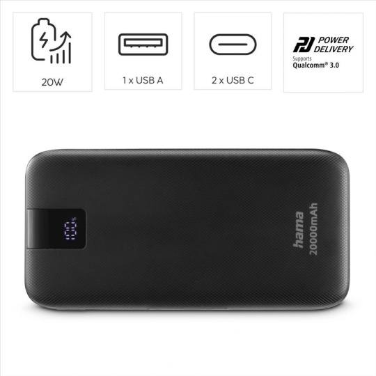 Hama PD 20 powerbanka, 20000 mAh, PD, Qualcomm, 3 výstupy: 2x USB-C, 1x USB-A, LED displej,