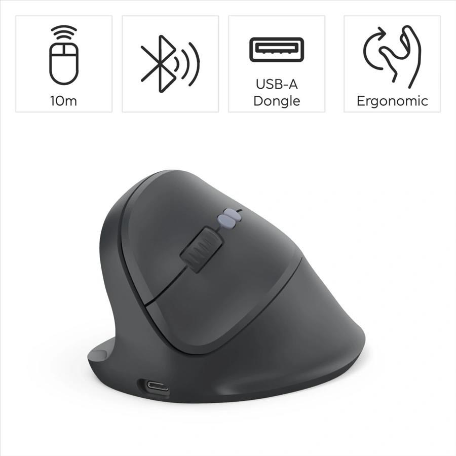 - 8-tlačidlová ergonomická bezdrôtová optická myš s voliteľným pripojením na tri zariadenia: 1x bezdrôtový USB prijímač a 2xBluetooth - vertikálne prevedenie predchádza presileniu a bolesti ramien a zápästí - ergonomický tvar vhodný pre ľavákov - integrovaný akumulátor, nabíjanie pomocou USB-C kábla - tichá, bez zvukov pri klikaní pre nerušenú prácu - DPI tlačidlo pre zmenu rozlíšenia (800/1200/1600 DPI) - nano USB prijímač môžete prenášať v tele myšky - aktivácia AI asistenta v systéme tlačidlom - tlačidlá s funkciou späť/vpred v prehliadači - pogumované rolovacie koliesko - polymerové kĺzne plochy - samostatný vypínač pre úsporu energie - 2,4 GHz technológia pre spoľahlivý a nerušený prenos signálu s dosahom až 10 m - telo a tlačidlá sú vyrobené z 65% recyklovaného ABS plastu - balenie je 100% bez plastov Systémové požiadavky: - bežné funkcie: Windows 11/10, Mac OS 11 alebo novšie - tlačidlo Assist: Windows 11 s aplikáciou Microsoft Copilot Technické parametre: - pripojenie: USB-A vidlica (RF 2,4 GHz). Bluetooth 5.2 - počet tlačidiel: 8 vrátane rolovacieho kolieska - rozlíšenie: 800/1200/1600 DPI - napájanie: integrovaný Li-Ion akumulátor - konektor nabíjania: USB-C zásuvka - dĺžka kábla: 1,8 m - rozmery: 8,6 x 11,5 x 7,1 cm - hmotnosť: 95 g - farba: čierna Obsah balenia: - myš EWM-600R - USB-A prijímač - nabíjací kábel USB A-C (1,8 m) so sťahovacou páskou - návod na použitie.
