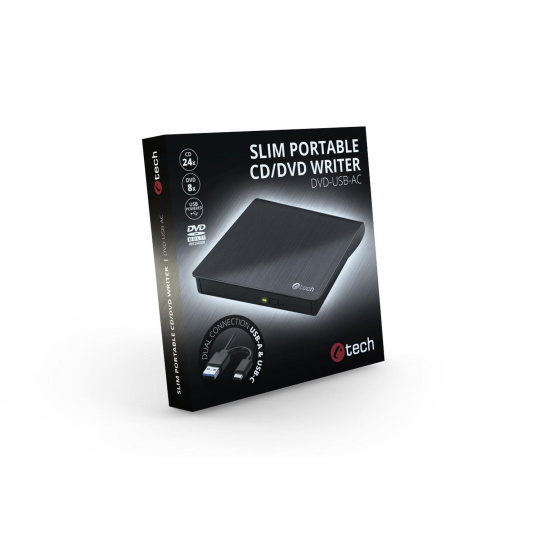 C-tech DVD-USB-AC je elegantná externá DVD vypalovačka, ktorá sa vyznačuje kompaktným a ľahko prenosným tenkým prevedením s integrovaným USB káblom. Predstavuje praktické riešenie pre PC a notebooky bez optickej mechaniky. Mechanika sa k zariadeniam pripája prostredníctvom integrovaného kábla USB-C alebo USB-A štandardu USB 2.0. Kábel je integrovaný v spodnej časti mechaniky, takže ho budete mať neustále k dispozícii. Napájanie celého zariadenia je len cez tento integrovaný USB kábel. Externá DVD vypalovačka umožňuje čítať a ukladať dáta na CD, rovnako aj na DVD s kapacitou 8,5GB pre dvojvrstvový disk a 4,7GB dát pre jednovrstvový disk. Vypaľovať môžete rýchlosťou až 8× v prípade DVD a 24× u CD. Podpora ochrany proti podtečeniu zásobníka navyše bráni možným problémom. DVD vypalovačka podporuje nielen štandardné 12cm CD a DVD, ale aj ich 8cm mini varianty. Mechanika podporuje Plug and Play štandard, takže ju stačí len pripojiť k zariadeniu a počkať na automatickú inštaláciu ovládačov a následne začať mechaniku plne využívať.