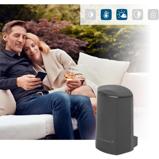 Kompaktný senzor s krytím proti nepriaznivým poveternostným vplyvom ponúka široké možnosti využitia v spojení s ďalšími zariadeniami systému Homematic IP. Zariadenie monitoruje vonkajšiu teplotu a relatívnu vlhkosť. Namerané hodnoty následne odovzdáva Centrálnemu jednotke (HmIP-HAP) a pripojeným zariadeniam Homematic IP, ktoré reagujú podľa vopred definovanej konfigurácie.