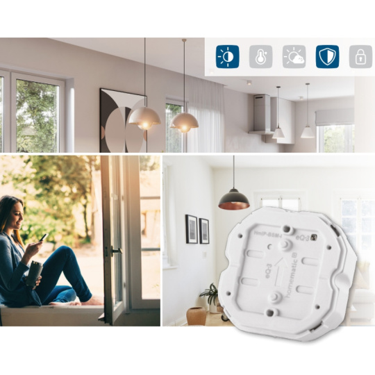 Spínací akčný člen (HmIP-BSM-I) sa montuje do štandardnej zápustnej elektroinštalačnej krabice pod omietku s pripojením do siete 230 V. Bezdrôtová komunikácia ponúka možnosť inštalácie bez potreby druhej kabeláže. To znamená, že akčný člen možno umiestniť v mieste pripraveného alebo existujúceho elektrického rozvodu siete 230 V.