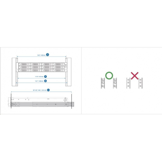 - Vzdialenosť medzi dvoma rackovými stĺpmi (meranie štvorcových otvorov racku stred-stred) je 18,3"(465 mm)