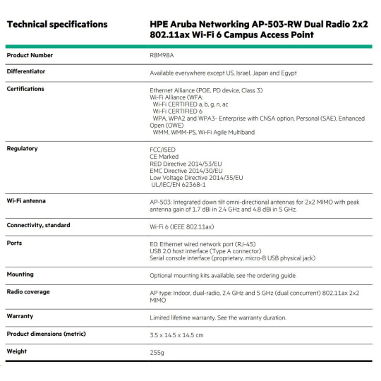 HPE Aruba Networking AP-503-RW Dual Radio 2x2:2 802.11ax Wi-Fi 6 Campus Access Point (Includes Mount Bracket) R8M98A REN.