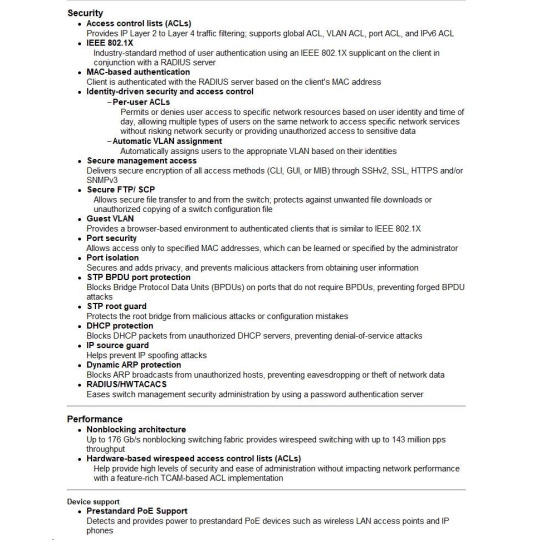 Provides up to 30 W per port that allows support of the latest PoE+-capable devices such as IP phones, wireless access points, and security cameras, as well as any IEEE 802.3af-compliant end device; eliminates the cost of additional electrical cabling and circuits that would otherwise be necessary in IP phone and WLAN deployments