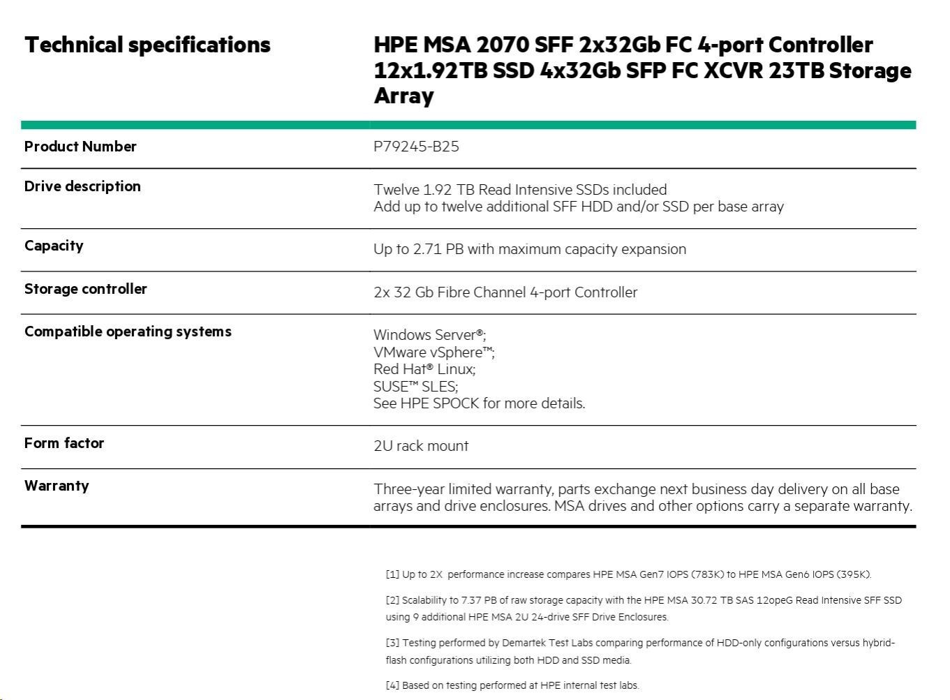 HPE MSA 2070 SFF 2x32Gb FC 4-port Controller 12x1.92TB SSD 4x32Gb SFP FC XCVR 23TB Storage Array.