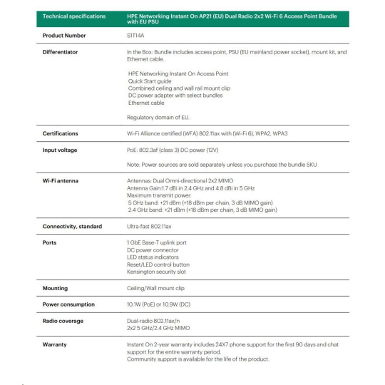 HPE Networking Instant On AP21 (EU) Dual Radio 2x2 Wi-Fi 6 Access Point Bundle with EU PSU.