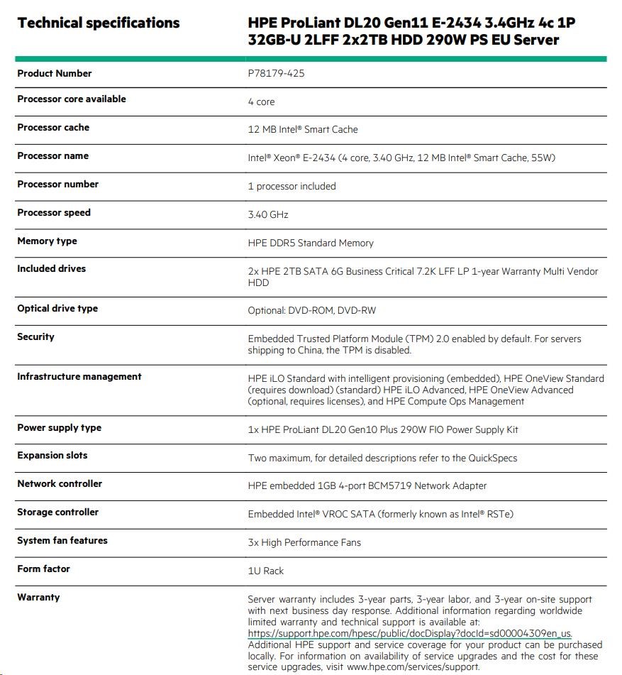 HPE PL DL20g11 6325P (3.5G/4C8T) 1x32G 2x2TB/7.2k SATA VROC 2LFF-HP 4p1Gb 290W Smart Choice