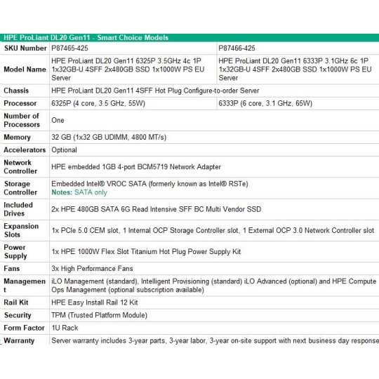 HPE PL DL20g11 6325P (3.5G/4C8T) 1x32G 2x480G SSD VROC 4SFF-HP 4p1Gb 1x1000W Smart Choice.