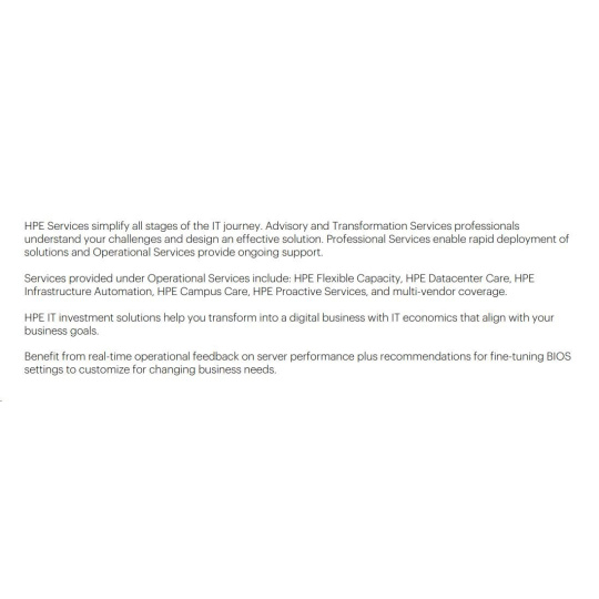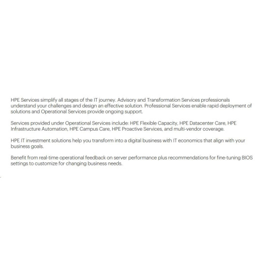 HPE Services simplify all stages of the IT journey. Advisory and Transformation Services professionals understand your challenges and design an effective solution. Professional Services enable rapid deployment of solutions and Operational Services provide ongoing support.