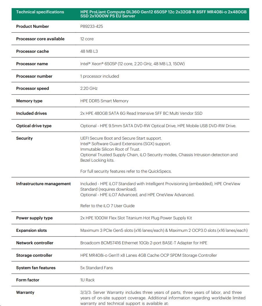 HPE PL DL360 Gen12 6505P (2.2/12C) 2x32G (P69727) 2x480G MR408i-o 8SFF 2x1000W 10GbE NBD333 Smart ChoicePE ProLiant Compute DL320 Gen12 Datasheet