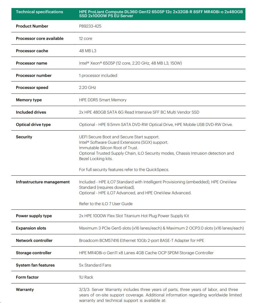 HPE PL DL360g12 6507P (3.5G/8C) 2x32G (P69727) 2x480G MR408i-o 8SFF 2x1000W 10GbE NBD333 Smart Choice.