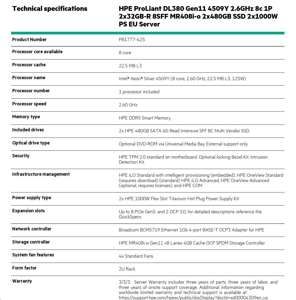 HPE PL DL380g11 4509Y (2.6/8C) 2x32G (p64706) 8SFF MR408i-o 2x480G 2x1000W 4x1Gb NBD333 Smart Choice.