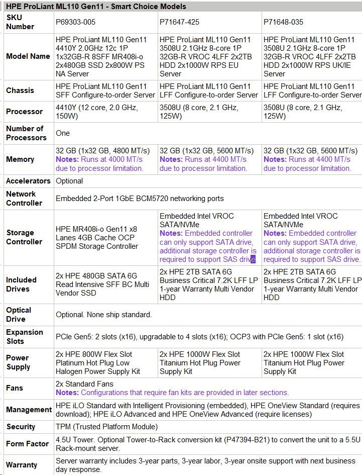 HPE PL ML110g11 3508U (2.1G/8C) 1x32G (p64706) 2x2TB/7.2k SATA 2x1000W 4LFF VROC 2x1G NBD333 Smart Choice