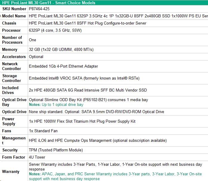 HPE PL ML30g11 6325P (3.5G/4C8T) 1x32G 2x480G SSD 8SFF VROC 1x1000W 4p1G NBD311 Smart Choice.