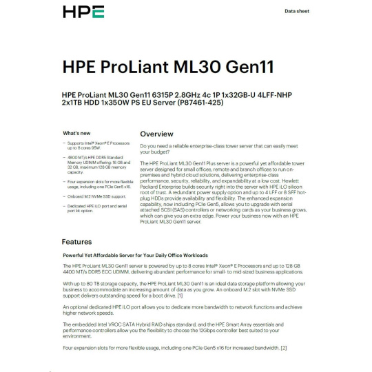 HPE PL ML30g11 6325P (3.5G/4C8T) 1x32G 2x960G SSD SATA 4LFF-HP VROC 1x1000W 4p1G NBD311 Smart Choice