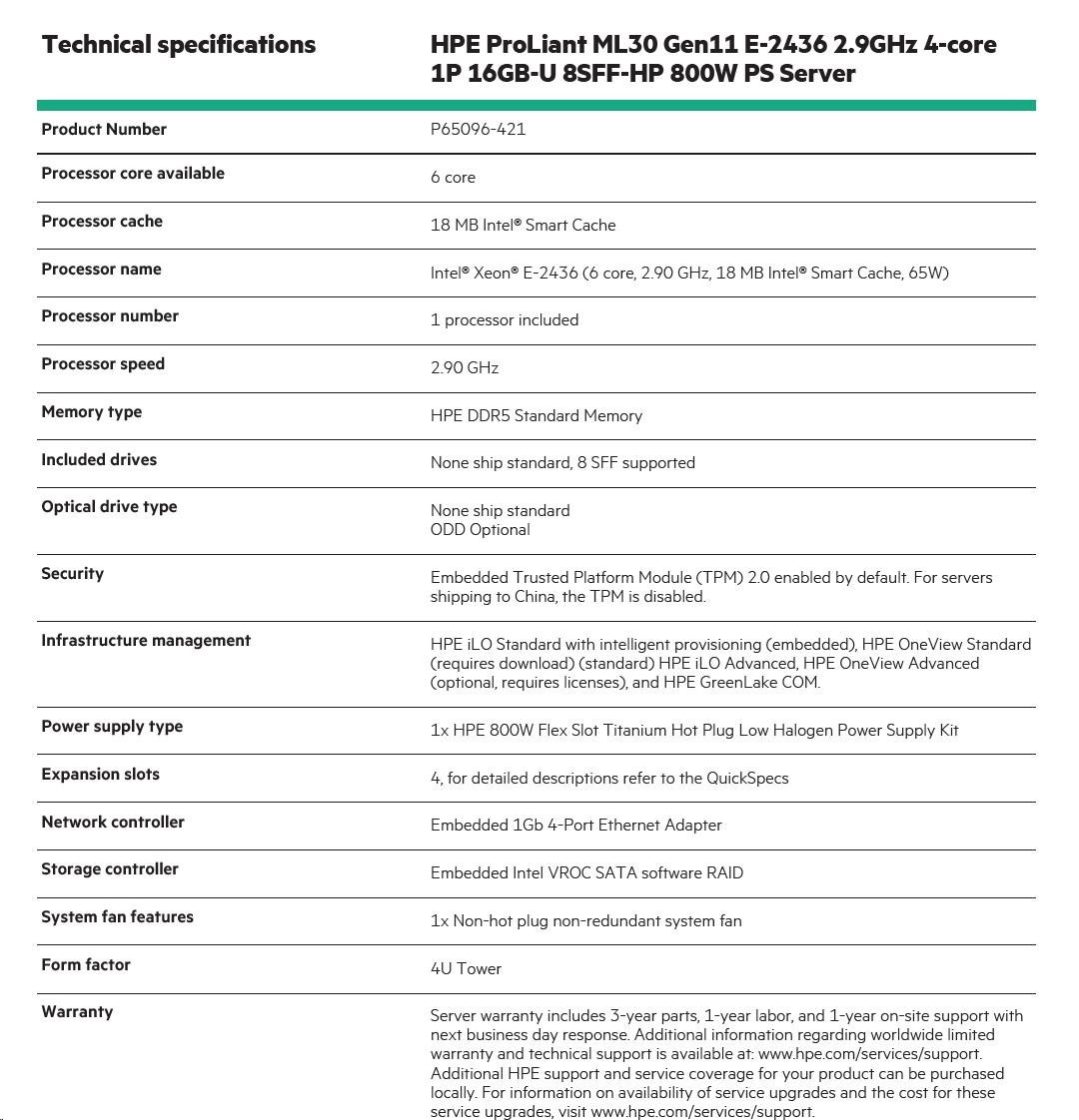 Technical specifications HPE ProLiant ML30 Gen11 E-2436 2.9GHz 4-core 1P 16GB-U 8SFF-HP 800W PS Server
